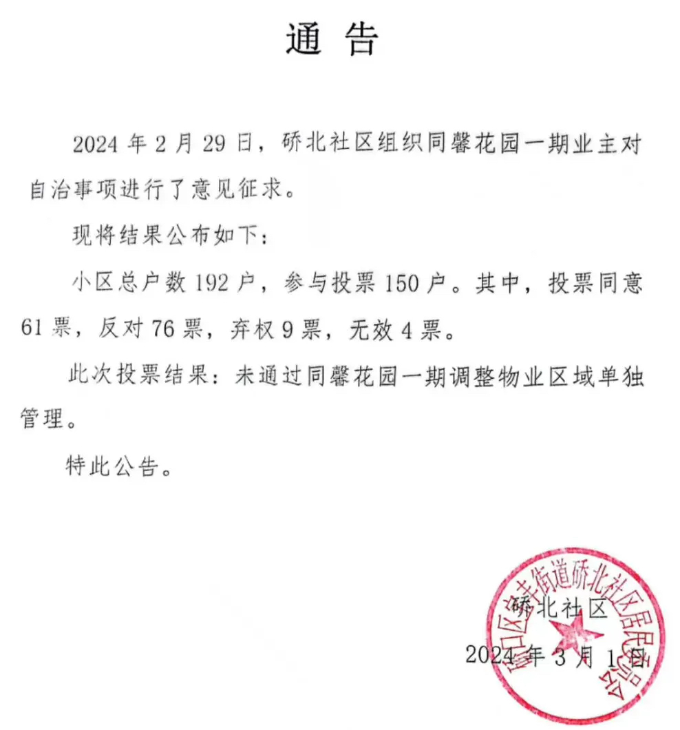 记者获取的一份宝丰街道硚北社区居委会3月1日发布的通告显示,2月29日,硚北社区组织同馨花园一期业主对自治事项进行了意见征求。小区总户数192户,参与投票150户。其中,投票同意61票,反对76票,弃权9票,无效4票。此次投票结果未通过同馨花园一期调整物业区域单独管理。