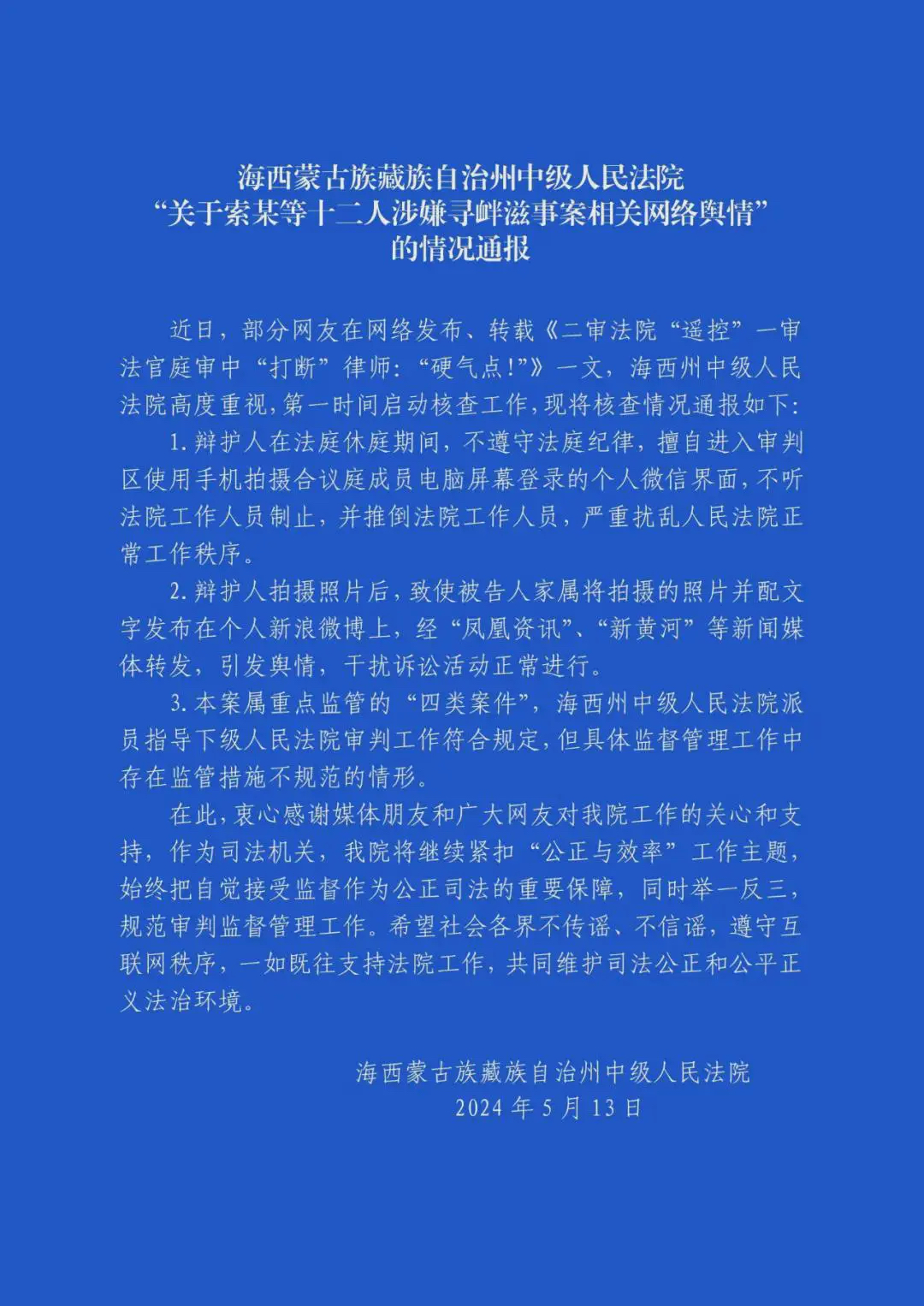 「原标题:海西蒙古族藏族自治州中级人民法院“关于索某等十二人涉嫌寻衅滋事案相关网络舆情”的情况通报」