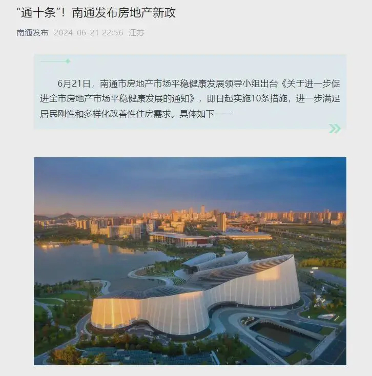 安徽省凤阳县日前出台楼市新政,明确给予退出宅基地奖励;江苏省南通市明确,自愿退出(放弃)农村宅基地进城购房的,给予一定额度的奖补,具体标准由全市各地自行制定……近日,多地出台鼓励放弃、退出农村宅基地相关政策,引发市场关注。256月21日,据微信公众号“南通发布”消息,当日,江苏省南通市房地产市场平稳健康发展领导小组出台《关于进一步促进全市房地产市场平稳健康发展的通知》,即日起实施10条措施,进一步满足居民刚性和多样化改善性住房需求。
