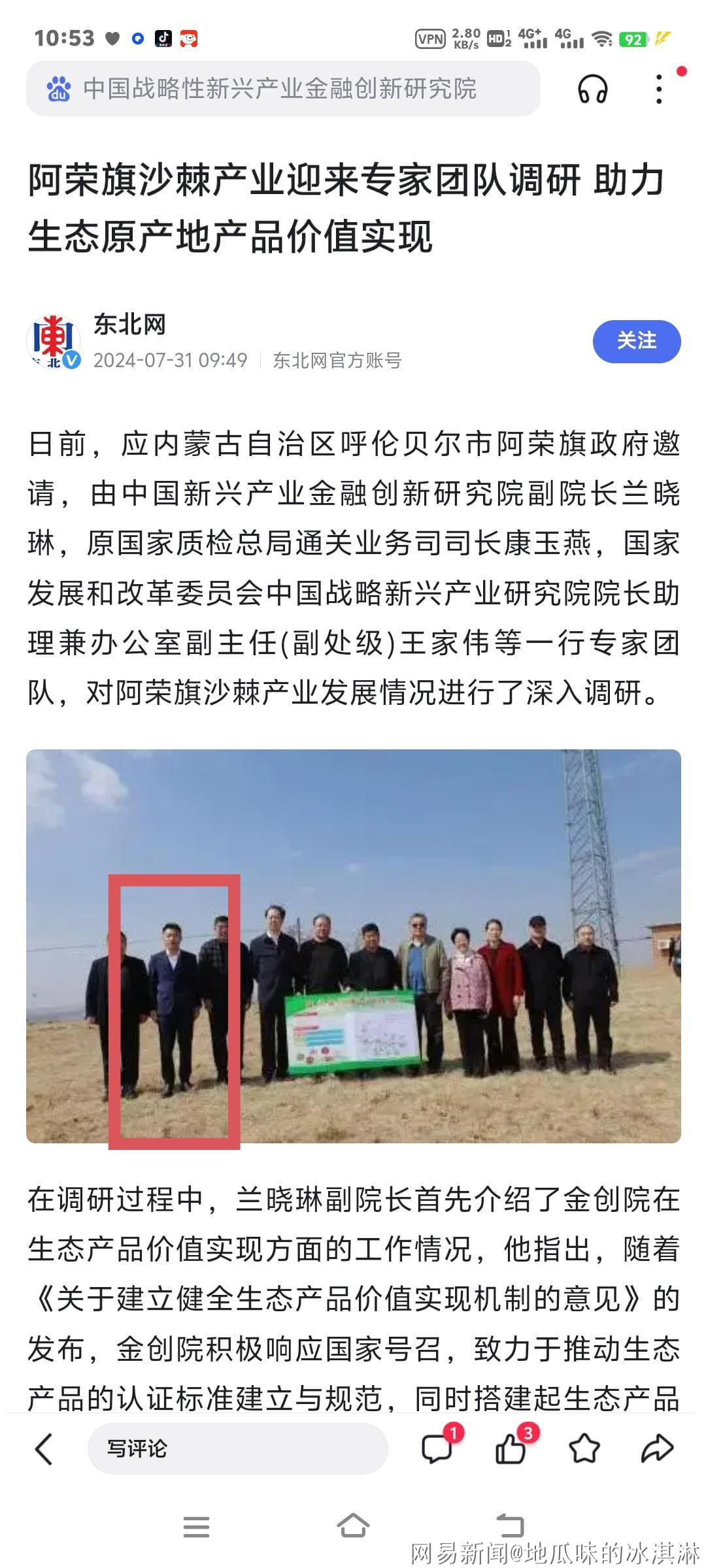 其二是在今年7月31日,一家黑龙江媒体刊发消息称,日前,应内蒙古自治区呼伦贝尔市阿荣旗政府邀请,由中国新兴产业金融创新研究院副院长兰晓琳,原国家质检总局通关业务司司长康玉燕,国家发展和改革委员会中国战略新兴产业研究院院长助理兼办公室副主任(副处级)王家伟等一行专家团队,对阿荣旗沙棘产业发展情况进行了深入调研。