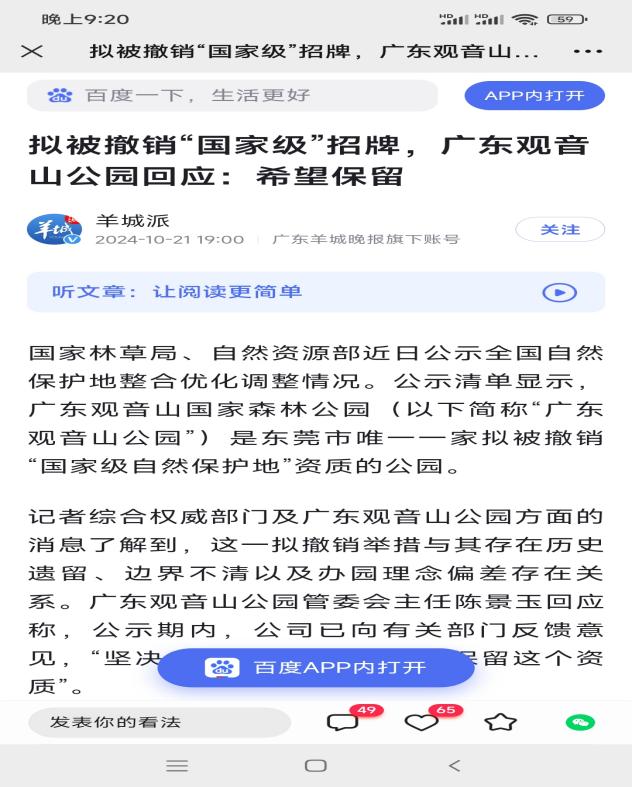 10月21日,羊城晚报发布《拟被撤销“国家级”招牌,广东观音山公园回应:希望保留》,文中显示:此次观音山公园将失去“国家级自然保护地”资质,其实早有预兆。2021年12月,由广东省自然资源厅、广东省林业局联合发布的《广东省自然保护地规划(2021-2035年)》(以下简称广东规划)就明确称,拟不再保留的 142处自然保护地包括自然保护区、森林自然公园、湿地自然公园三类,其中国家级1处为广东观音山国家森林公园,其余均为市县级自然保护地。