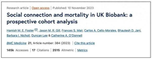 参考文献[1] Foster HME, Gill JMR, Mair FS, Celis-Morales CA, Jani BD, Nicholl BI, Lee D, O’Donnell CA. Social connection and mortality in UK Biobank: a prospective cohort analysis. BMC Med. 2023 Nov 10;21(1):384.
