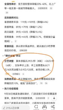 也有网友质疑降价的诚意。草原嫩烤羊排从119元降至109元,降幅不足10%,被认为远未达到网传的“最高降4成”。还有消费者发现,一道“鸡汤白玉山药炖豆腐”的价格不降反升。
