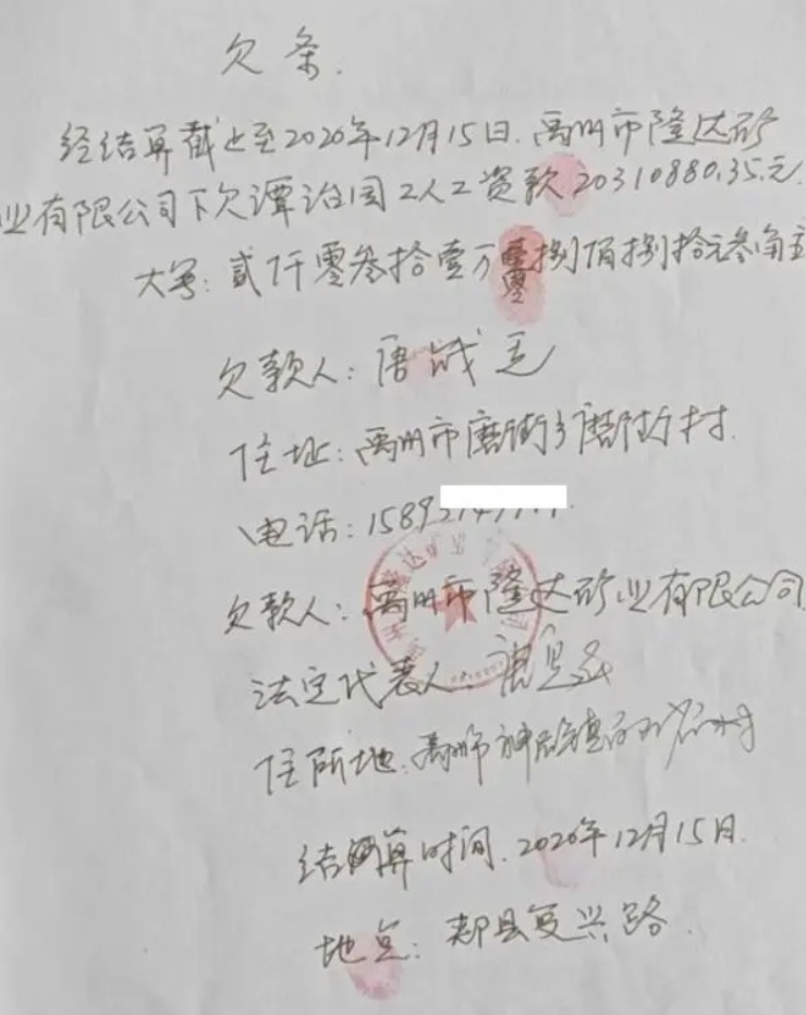 2020年12月15日,隆达矿业公司和实际控制人唐战廷签订结算协议并出具欠条,法人唐魁签字盖章确认2020年1月1日至12月25日,隆达矿业公司欠谭治国工人工资款达2031万零883.5元。