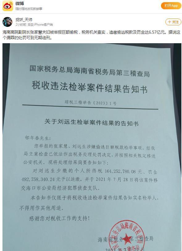 据微博捉妖_天师消息 海南高院副院长张家慧夫妇被举报巨额偷税,税务机关查实,追缴偷逃税款及罚金达6.57亿元。据说这个漏罪的处罚可到无期徒刑。