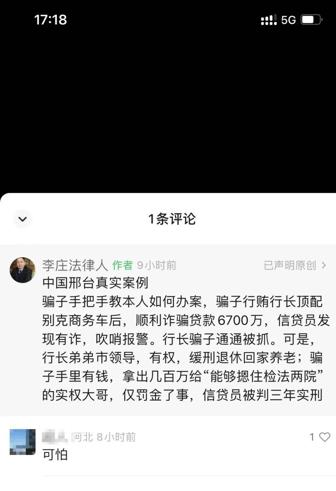 李庄在网络平台发布的录音配文指出:“骗子手把手教本人如何办案,骗子行贿行长顶配别克商务车后,顺利诈骗贷款6700万,信贷员发现有诈,吹哨报警,行长骗子通通被抓。可是,行长弟弟市领导,有权,缓刑退休回家养老;骗子手里有钱,拿出几百万给‘能够摁住检法两院’的实权大哥,仅罚金了事,信贷员被判三年实刑。”